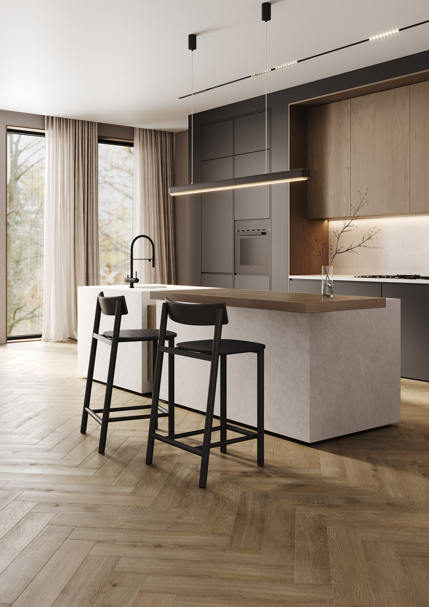 33/42 класс износостойкости и усиленный защитный слой 0,5 мм дают ту самую практичность, кварцевый ламинат выдерживает повседневные нагрузки. V-образная крашеная фаска делает каждую плашку визуально более выразительной в укладке «ёлочкой».
